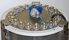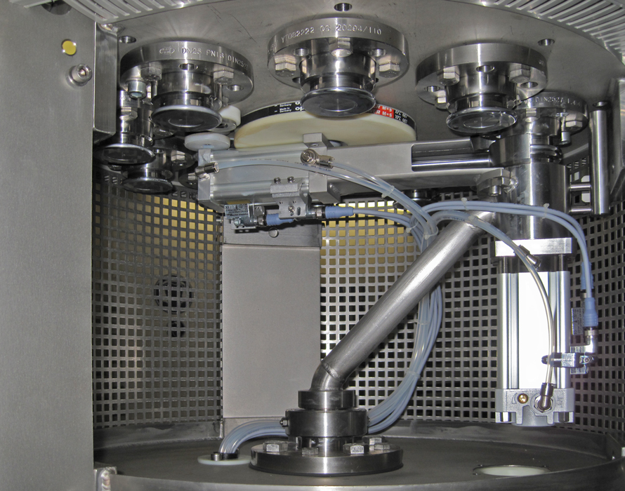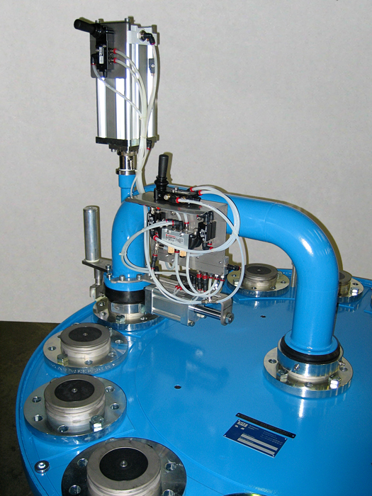 Die Verbindung von Vater- und Mutterkupplung des vollautomatischen Drehverteilers (siehe oben) erfolgt über einen pneumatisch angetriebenen Halbring