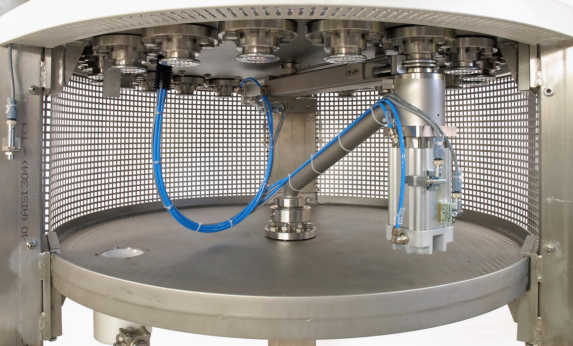 Hier dargestellt ist ein manueller Vollsystemdrehverteiler 1 auf 14 mit U-Arm. Das Öffnen, Schließen sowie die Verriegelung erfolgt pneumatisch. Hier in der Nennweite DN 80
