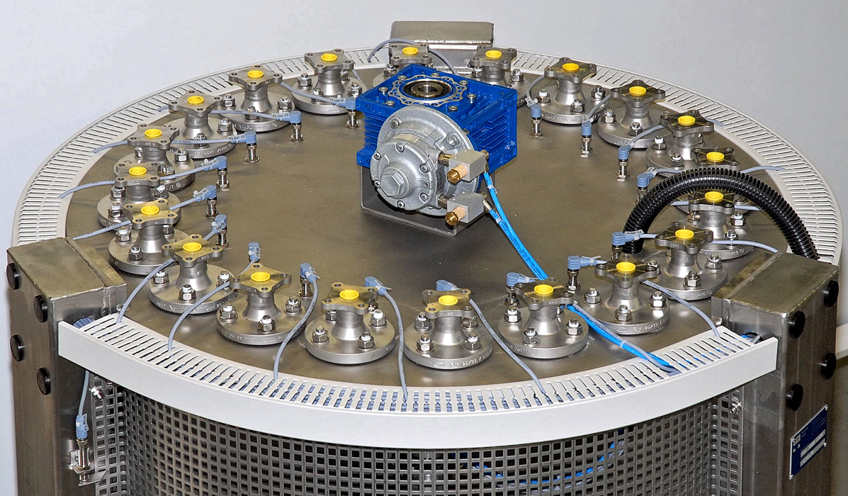 Vollautomatischer Drehverteiler 1 auf 20 in der Nennweite DN 25 mit S-Arm. Hier: Einbaulage über Kopf